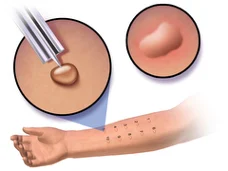 - L’intradermo-réaction ou tests intra dermiques sont utilisés pour l’exploration des allergies aux médicaments et aux piqûres d’hyménoptères (guêpes, abeilles). Le test suit le même principe qu’un prick test, sauf que le liquide dans lequel est présent l’allergène est cette fois directement injecté dans la couche dermique de la peau. Il est suivi d’une surveillance hospitalière pour vérifier la présence d’une réaction.